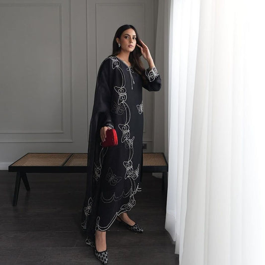 Ayeza Khan - Black Linen Koti, Long Shirt, Trouser and Dupatta set | 50% OFF