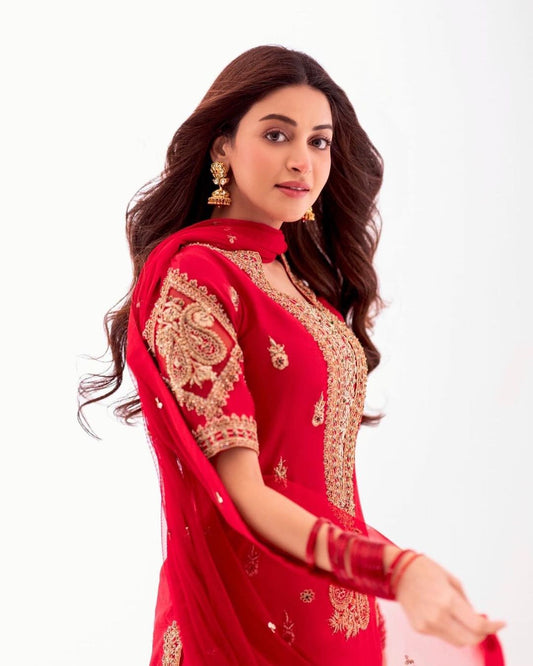 Anmol Baloch - Red Raw Silk Shirt, Trouser and Dupatta Outfit | Reshmi Shirt | 50% OFF | COD