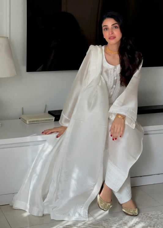 Anmol Baloch - White Silk Shirt, Trouser with Dupatta | Reshmi Shirt | COD | 60% OFF