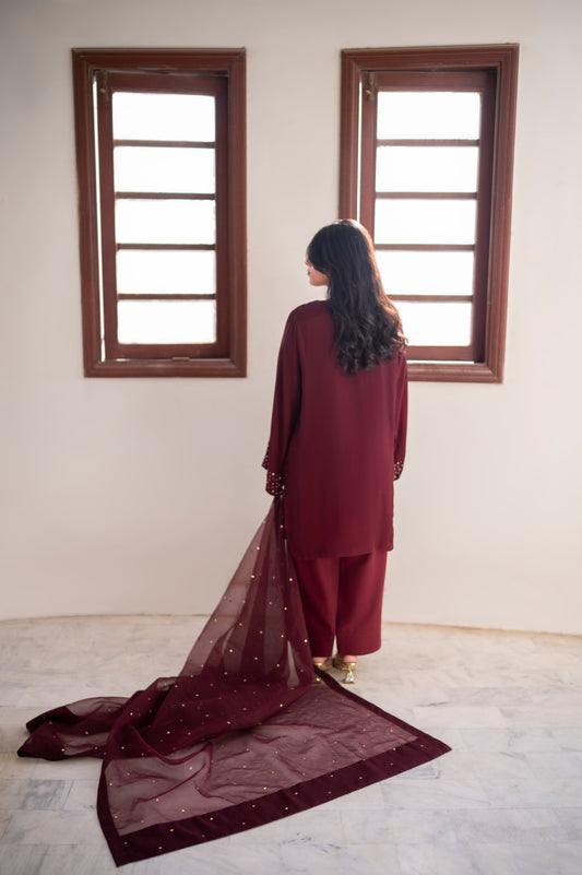 Ayeza Khan - Maroon Dusk Shirt, Trouser with Dupatta - COD | 50%