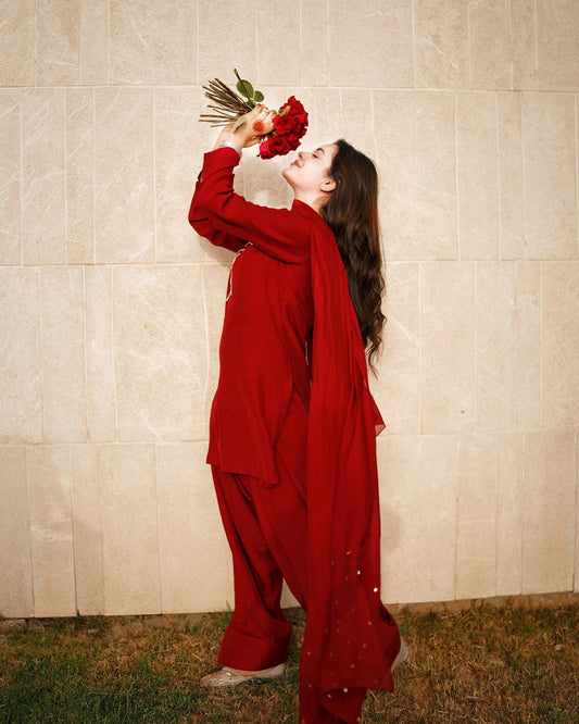 Anmol Baloch - Red Raw Silk Shirt, Trouser and Dupatta Outfit | Reshmi Shirt | 50% OFF | COD