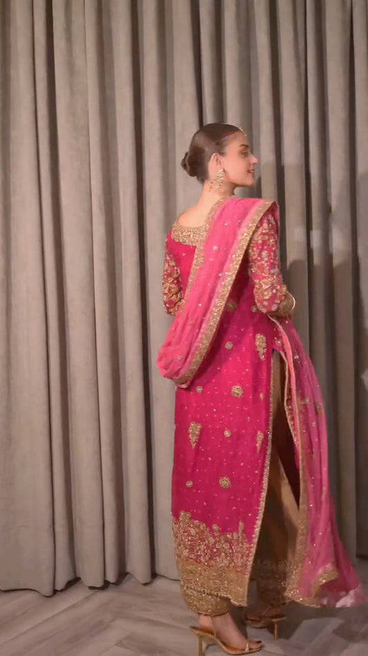 Hira Mani - Embroidered Rose Pink Long Shirt, Trouser and dupatta set | 50% OFF