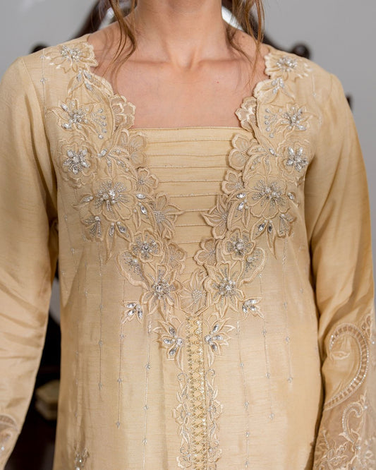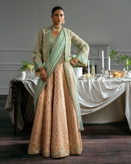 Hira Faisal - Embellished Peach Long Shirt, Trouser and Dupatta set | 50% OFF