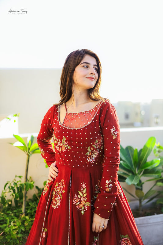 Hania Aamir Maroon Bridal Gown - Silk and Organza | 50% OFF