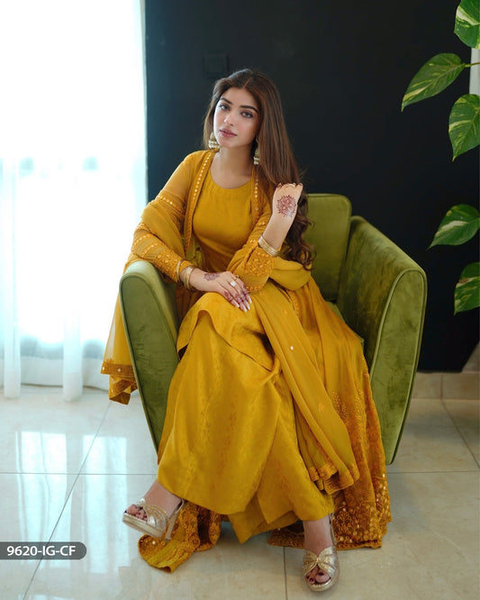 Kinza Hashmi - Chiffon Embroidered Mustard Frock Trouser and Dupatta | 40% OFF