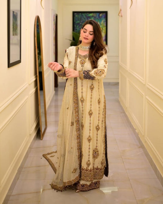 Minal Khan - Nikhat Egg Shell Shirt, Trouser and Dupatta | 50% OFF