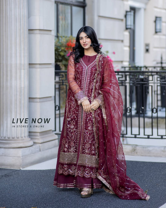 Sarah Khan - Maroon Long Shirt, Trouser and Duaptta set | 60% OFF