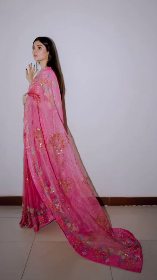 Durefishan Saleem - Pink Blush Embellished Organza Saree | COD | 60% OFF