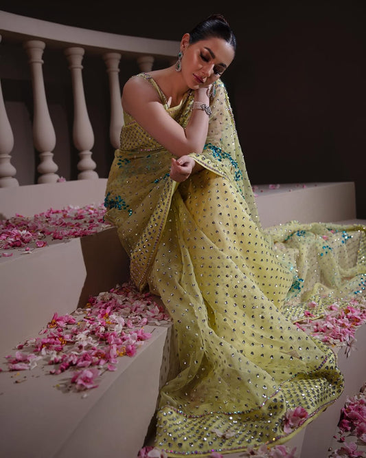 Hania Aamir - Verbena Yellow Embellished Organza Sari | 70% OFF