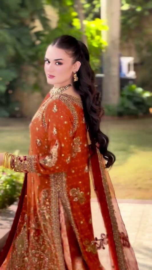 Hania Aamir Maroon Bridal Gown - Silk and Organza | 50% OFF