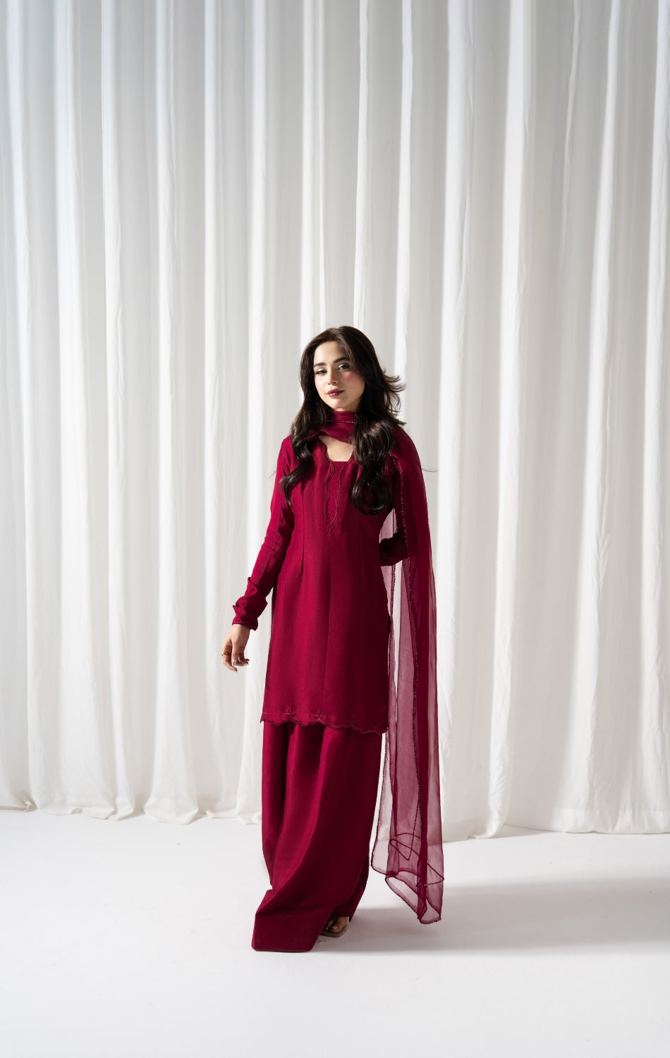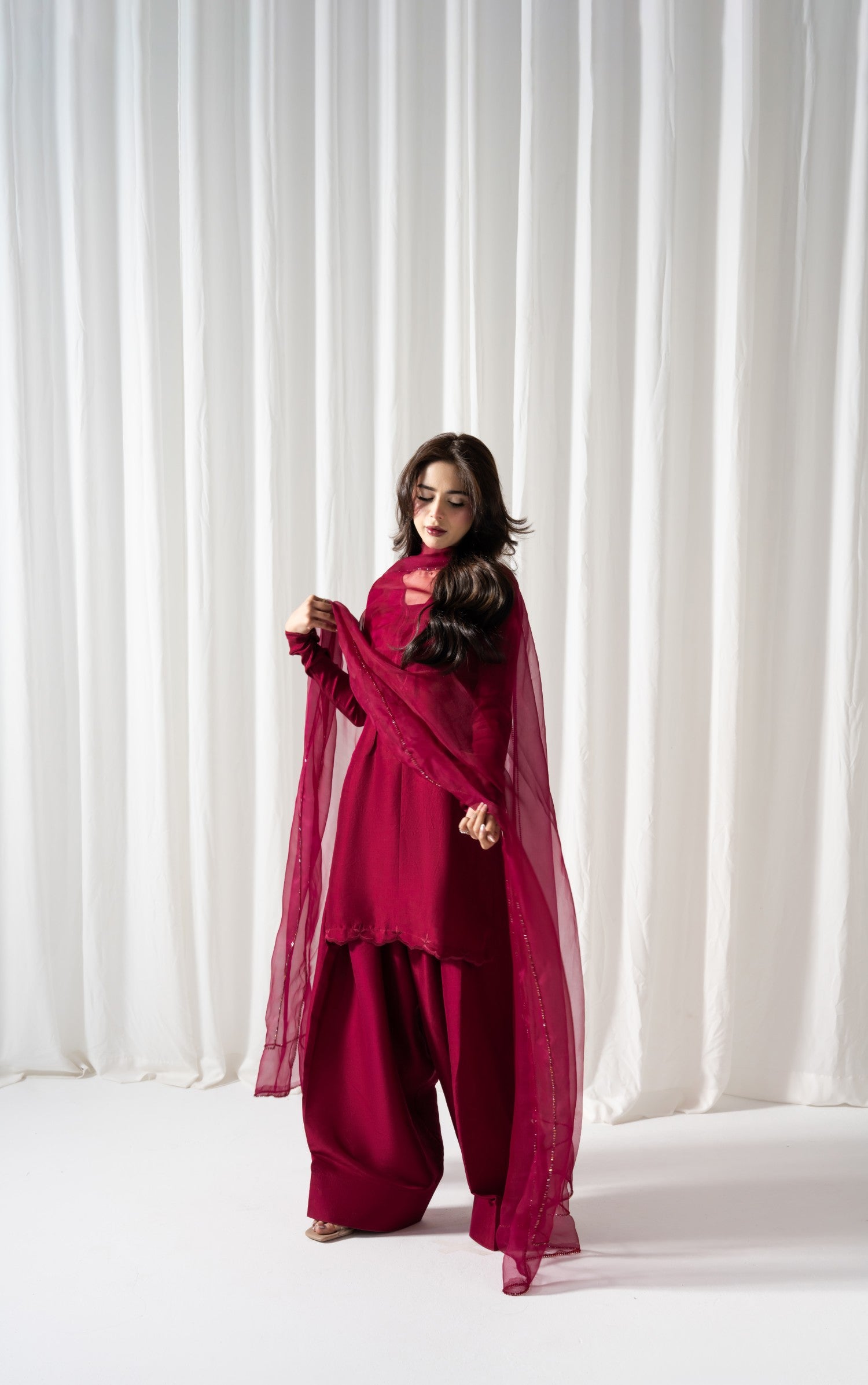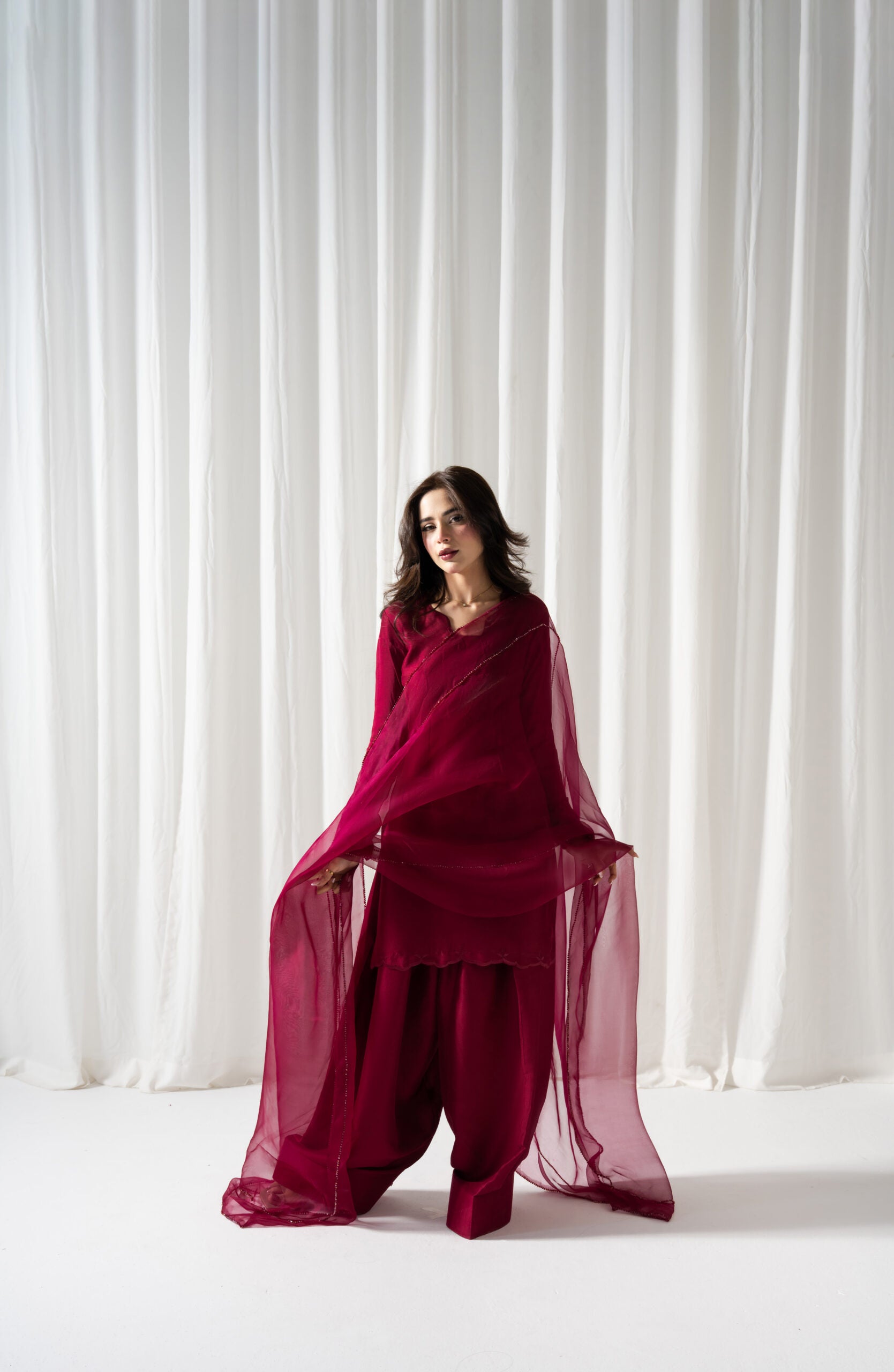 Aima Baig - Beetroot Shirt, Farshi Shalwar with Dupatta - COD | 50% OFF