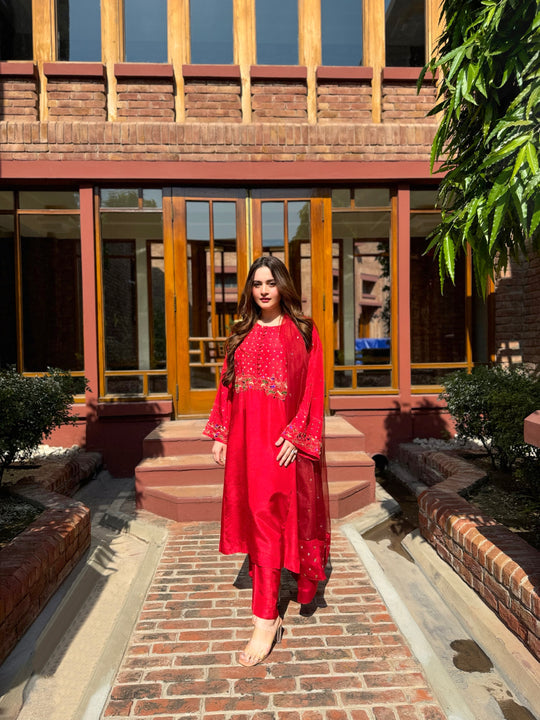 Fabric:ย Shirt,ย Trouser: Raw Silk, Dupatta: Organza