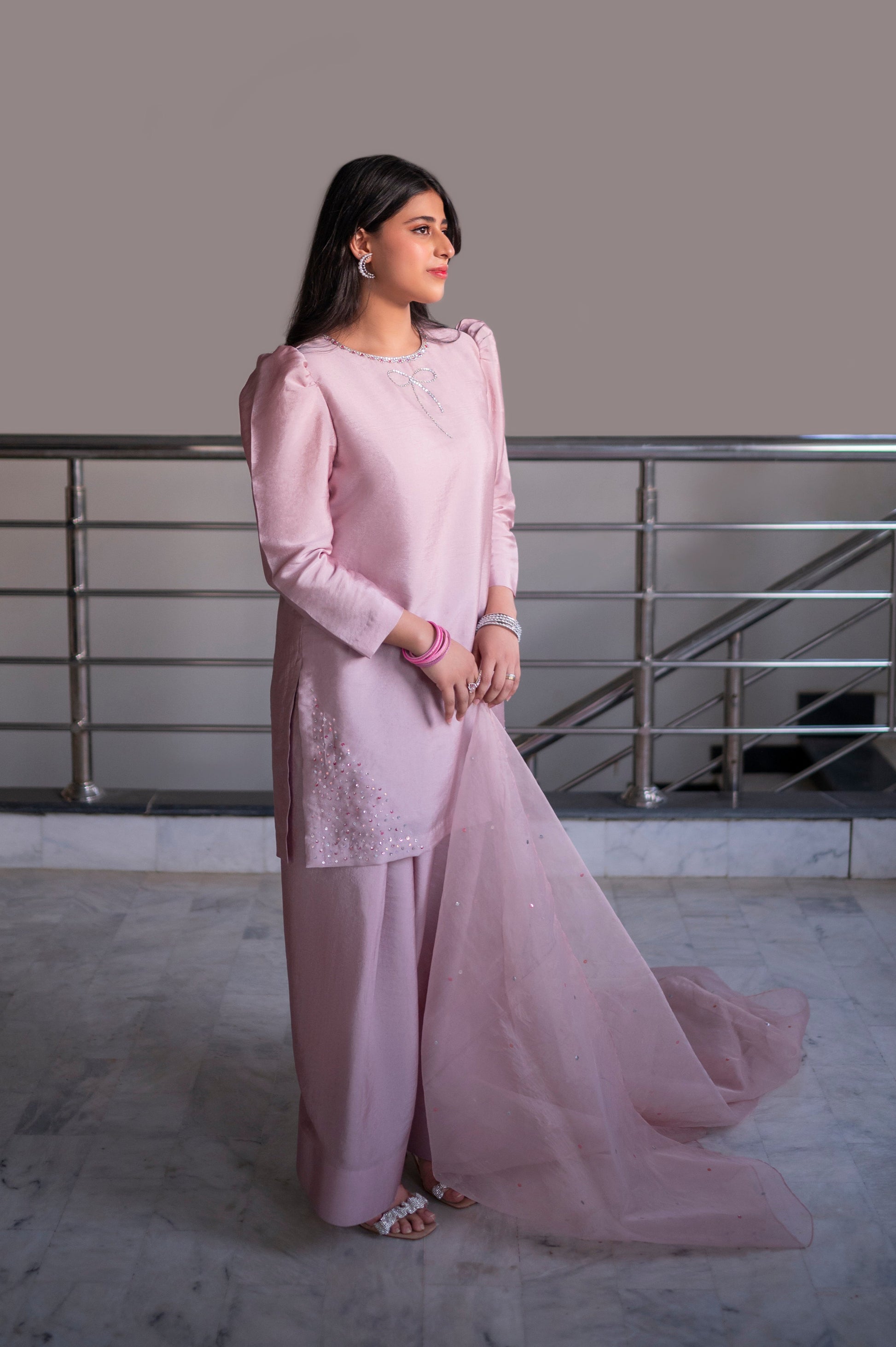This chic lilac short shirt features a round neckline with hand embellishments and a cute bow detail. The daman is enhanced with a contrasting chan spray, and the 3/4 puff sleeves add a stylish touch. Paired with a flowing Farshi shalwar and an elegant organza dupatta, this set is perfect for a refined, contemporary look.