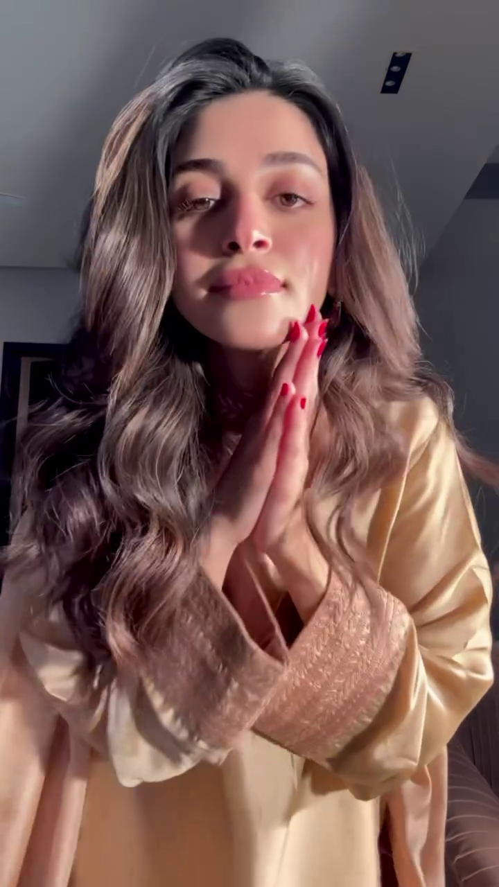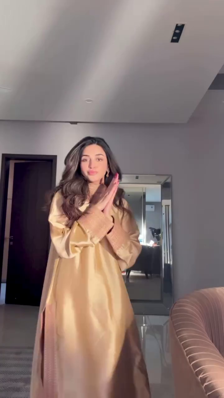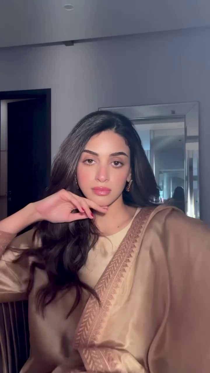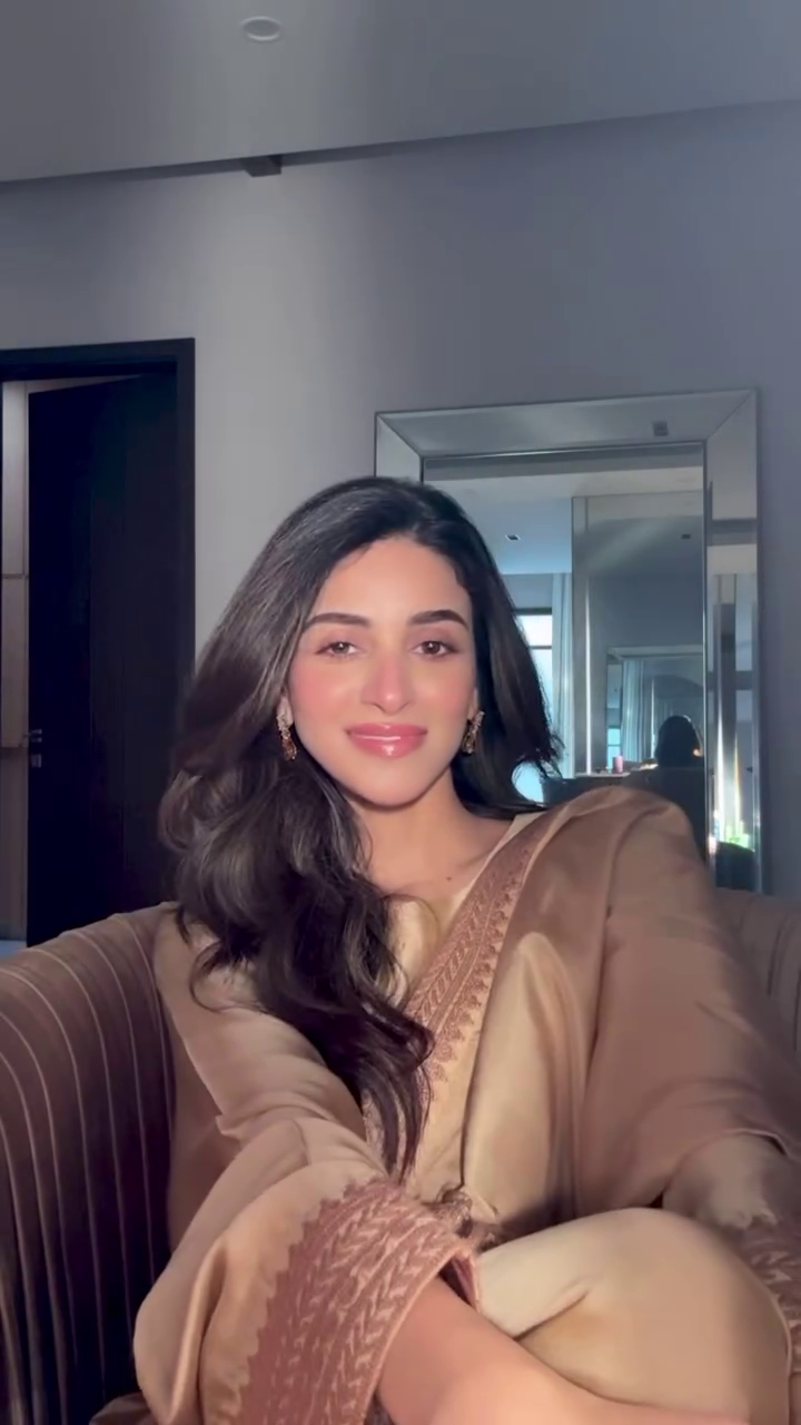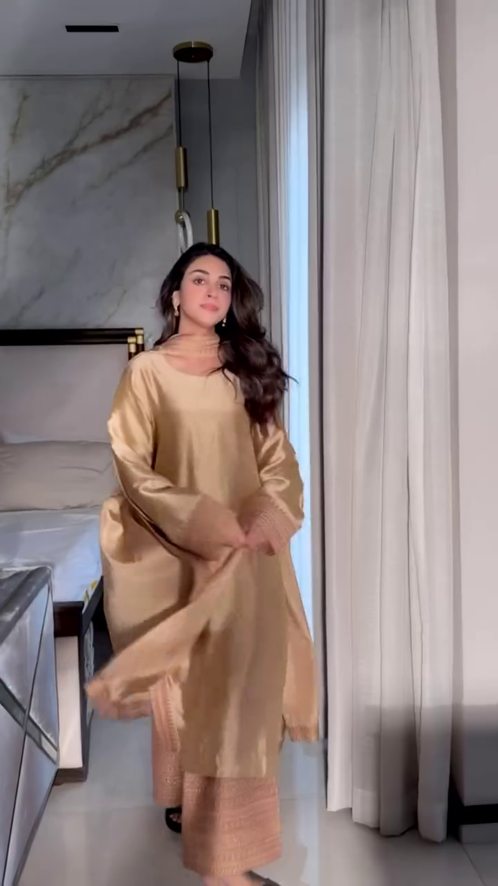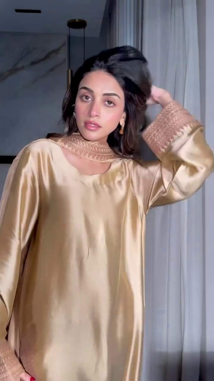 Experience the exquisite beauty of Anmol Baloch with this must-have Collectible. She looks mesmerizing in a chic beige tunic, blending timeless elegance with modern flair. This beautiful ensemble consists of a beige shirt paired with straight pants made of silk. The outfit features delicate detailing on the neckline and sleeves, adding a touch of elegance and sophistication to the overall look.