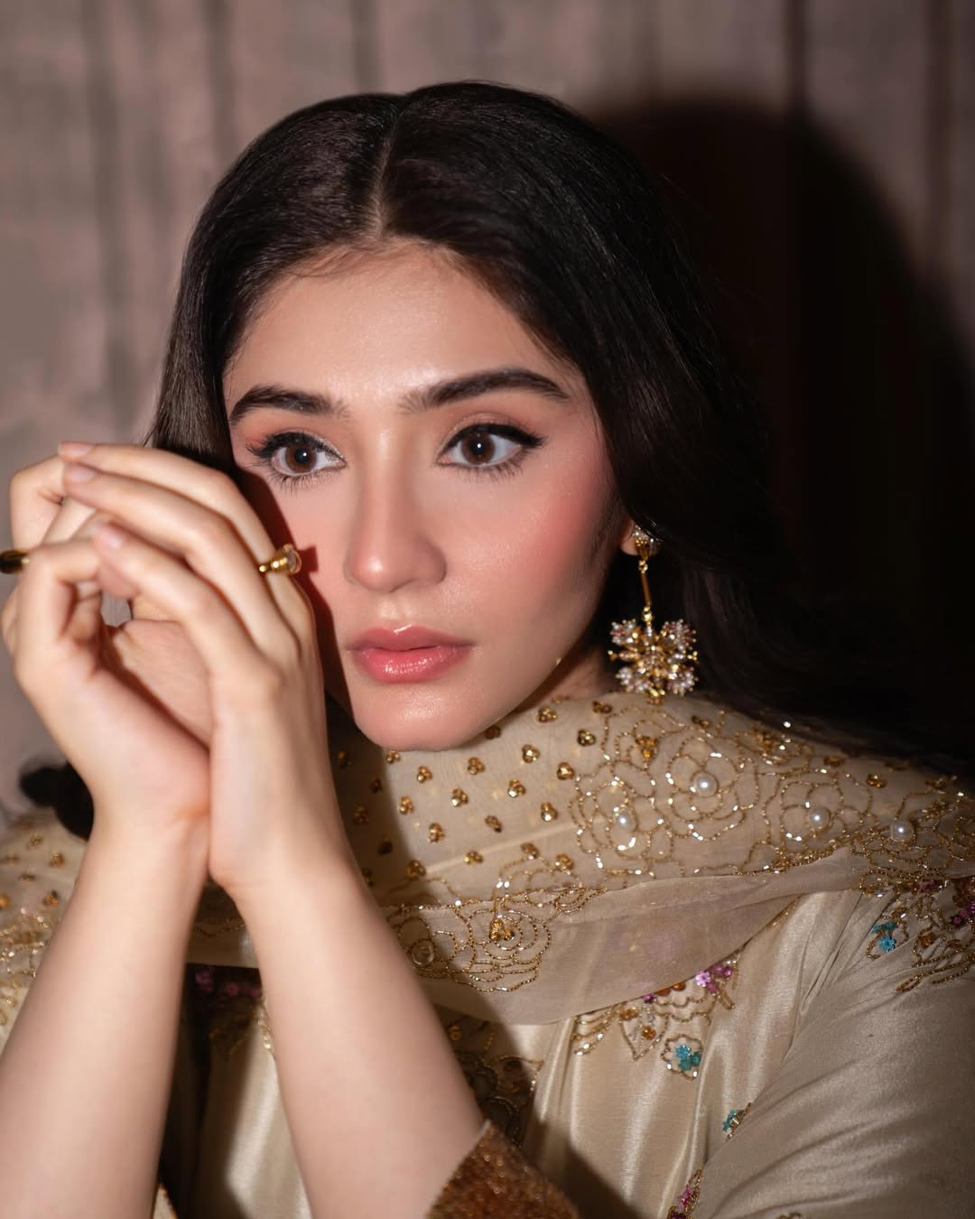 A statement in elegance, this Lambs Wool Creme toned tunic is adorned with gold and turquoise french sequins on the borders paired with a matching shalwar and a lightly embellished organza dupatta, this ensemble blends traditional charm with refined glamour.