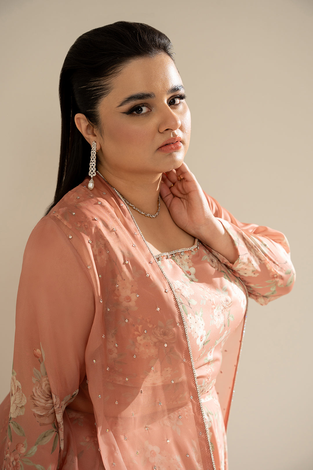 - This Peach Floral shrug made in Soft silk fabric features embellished front, full-length sleeves and front open silhouette with a flared hem.
