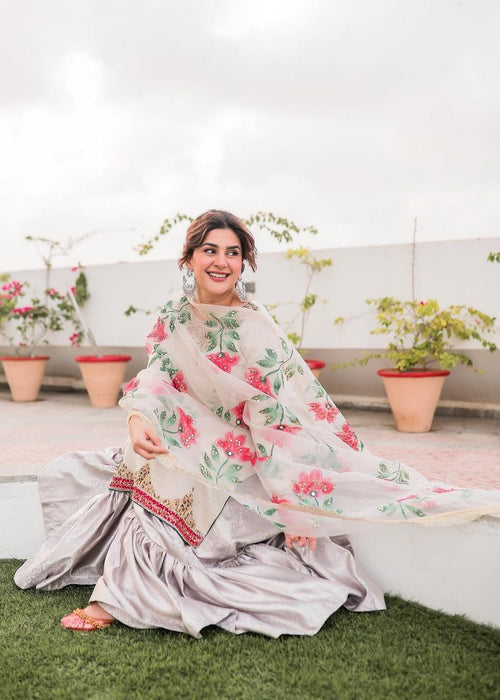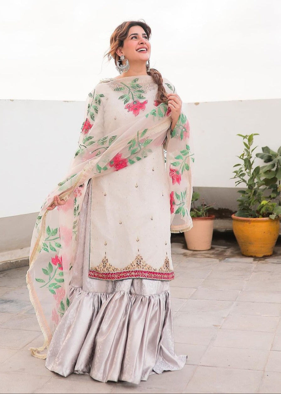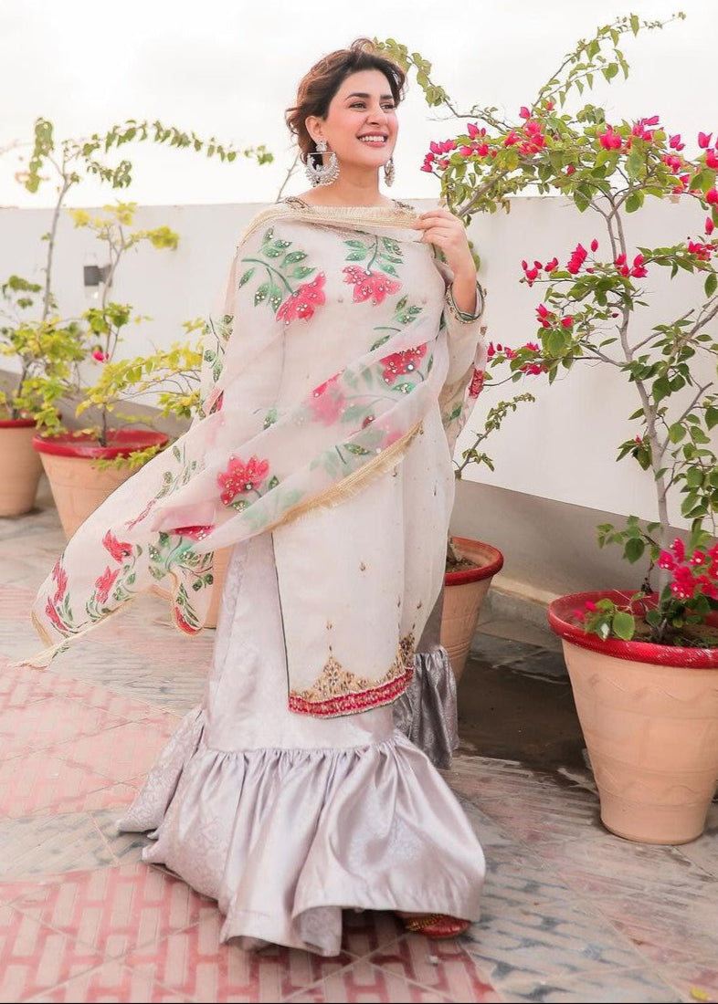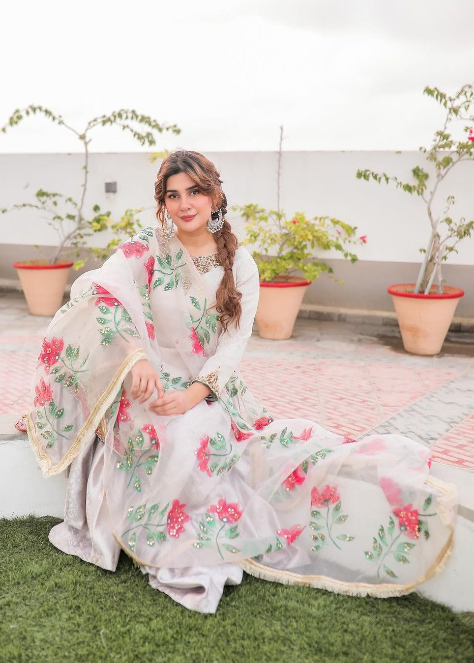 Kubra Khan White Floral Shirt, Ghagra with Dupatta | COD | 50% OFF