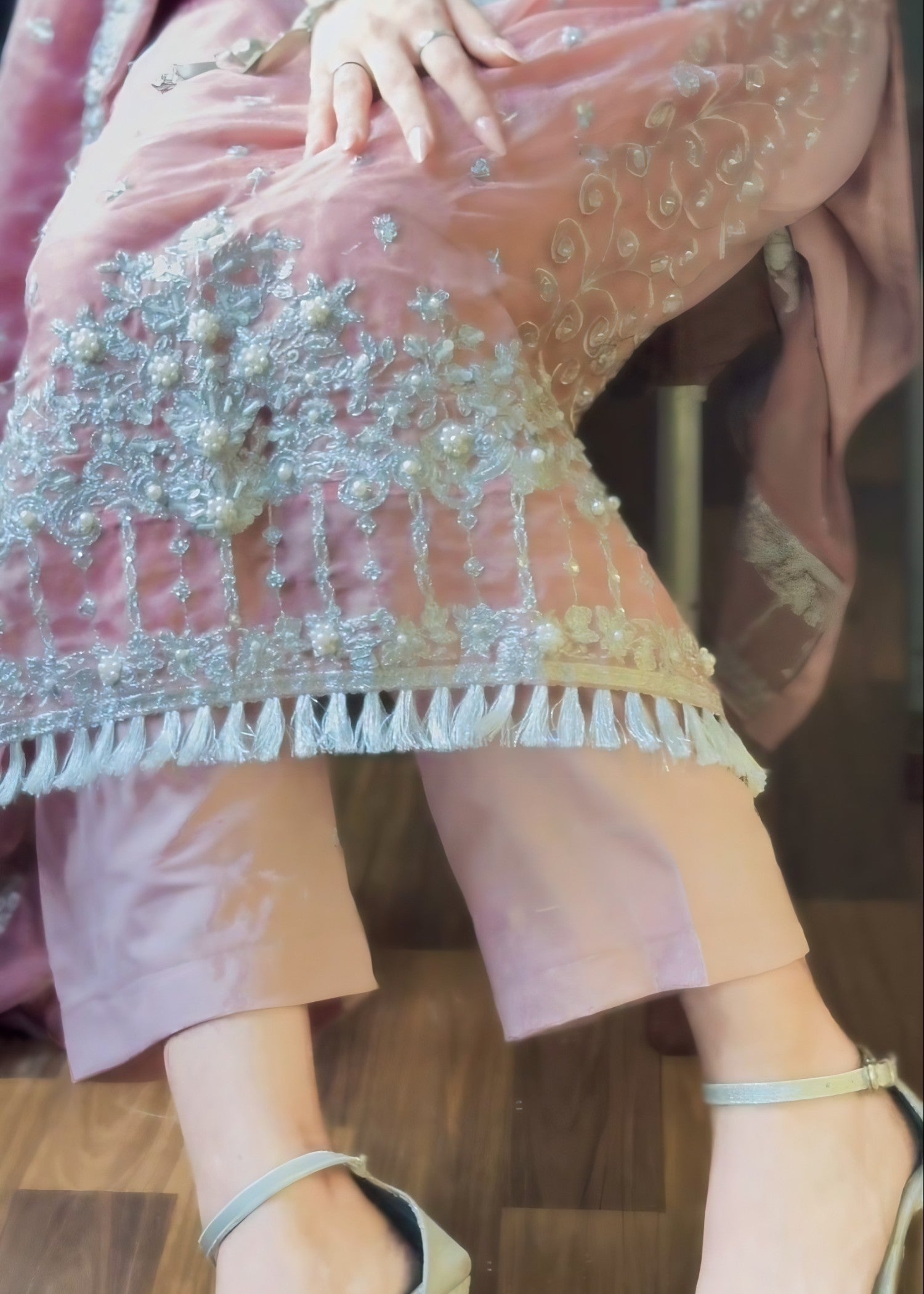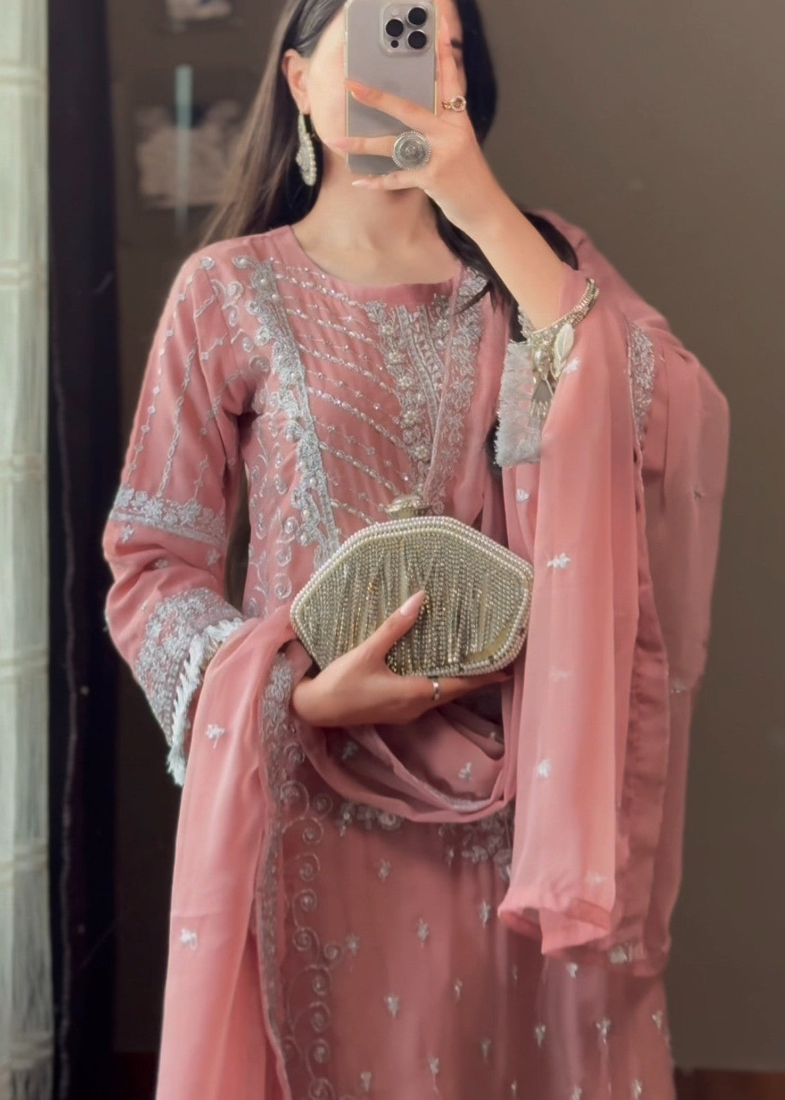 Additional Description: New arrival: Elegant chiffon fabric featuring beautiful silver embroidery, paired with a chiffon embroidered dupatta. Complete the look with soft satin fabric trousers for a luxurious and stylish ensemble.