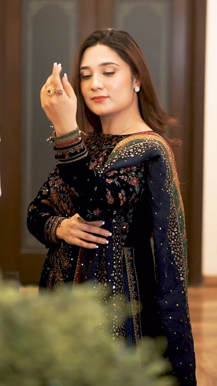 Elevate your formal wardrobe with this timeless piece, its perfect for Mehndi and Dholki events. Merium Pervaiz's new winter outfit! Elevate your style with this embroidered velvet shirt, trouser and dupatta. Save 40% with COD. Merium Pervaiz New Dress Collectible.