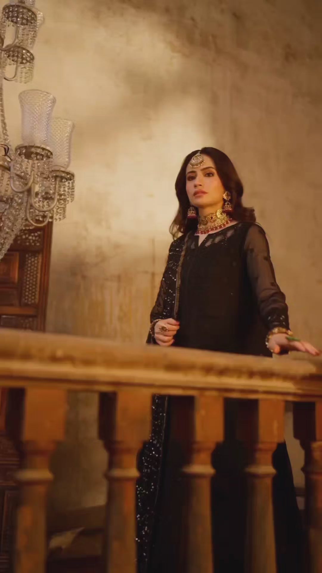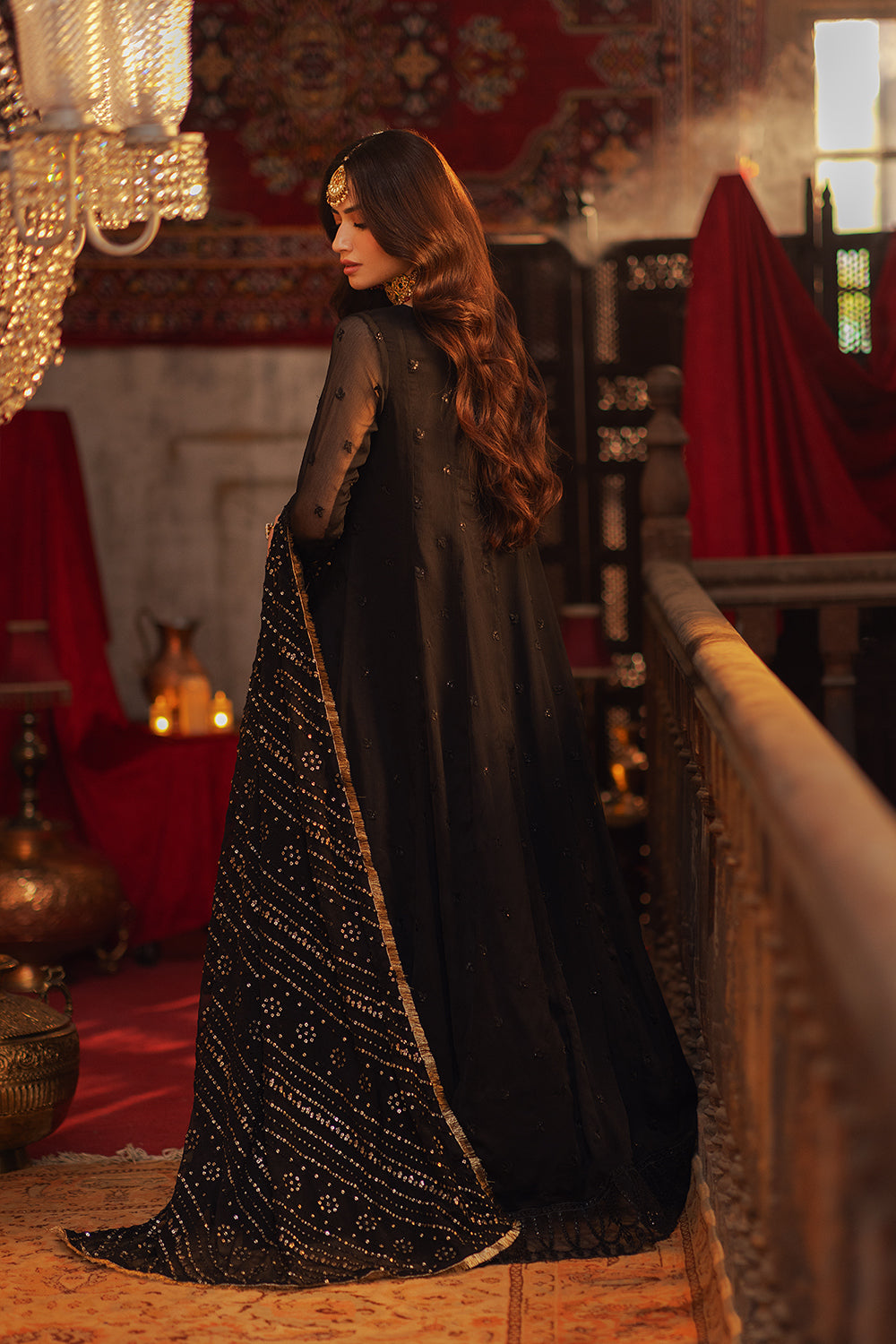 Sana Javed Collectible โ a captivating masterpiece crafted in black canvas, exuding an aura of timeless elegance and regal allure. Adorned with sequins and meticulously embroidered organza patch appliqued on the neckline, this chiffon frock commands attention with every shimmering detail. Sleeves enhanced with intricate cutwork organza lace add a touch of mystique, while the border, adorned with embroidered organza lace, exudes sophistication and grace. Paired with raw silk pants. Draped delicately around the shoulders, the heavily embellished twin sequins dupatta, finished with dhanak lace on all sides, enveloping you in an aura of noir magnificence.